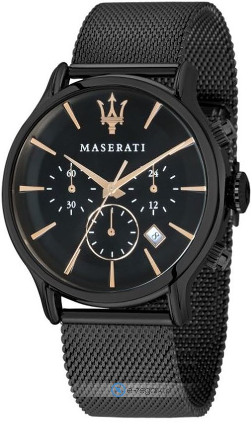 Zegarek męski R8873618006 marki Maserati to stylowe połączenie funkcjonalności oraz modnego wzornictwa. Styl zapewnia wysokiej klasy tarcza w kolorze czarnym. Godzina zaprezentowana jest w sposób analogowy co intuicyjnie pozwala ją odczytać. Koperta w odcieniach koloru czarnego szeroka jest na 42 mm oraz ma grubość 12 mm - cechuje się okrągłym kształtem.