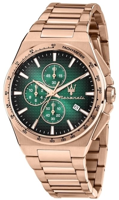 Męski zegarek Maserati R8873653001 to zegarek, który dzięki swemu wzornictwu zawsze będzie prezentował się dobrze. Ciekawy wygląd czasomierza uzyskano m.in. poprzez cyferblat w kolorze zielonym. Zegarek ten prezentuje aktualny czas w formacie analogowym dzięki czemu odczyt jest bardzo łatwy. Koperta jest w kolorze różowo złotym szeroka jest na 42 mm oraz ma grubość 12 mm - posiada okrągły kształt.