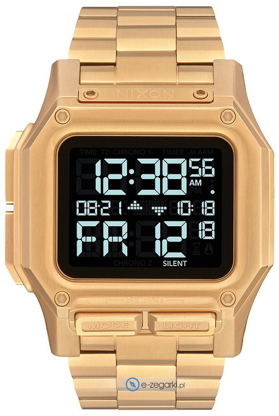 Nixon A1268-502 - męski zegarek przeznaczony dla osób szukających zegarka z kolekcji Nixon Regulus SS. Atrakcyjny wygląd zegarka uzyskano także dzięki tarczy w kolorze czarnym. Aktualna godzina prezentowana jest w sposób cyfrowy co bez trudu pozwala ją odczytać. Koperta w barwach koloru złotego szeroka jest na 46 mm oraz ma grubość 14 mm.