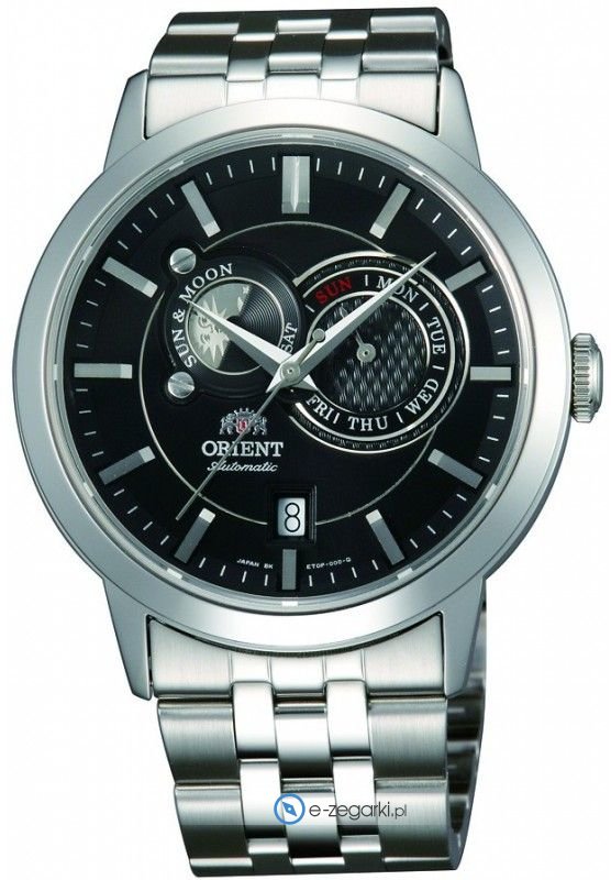 Model FET0P002B0 marki Orient to stylowy zegarek naręczny męski, który wyposażono w ciekawe rozwiązania oraz funkcje. Niebanalny wygląd czasomierza osiągnięto także dzięki tarczy w kolorze czarnym. Zegarek ten prezentuje godzinę w formacie analogowym dzięki temu odczyt jest bezproblemowy. Koperta jest w kolorze srebrnym szeroka jest na 41 mm oraz ma grubość 14 mm - charakteryzuje się okrągłym kształtem.