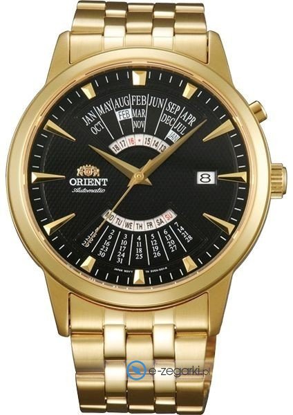 Zegarek męski FEU0A002BH marki Orient to dobre połączenie funkcjonalności oraz ciekawego wzornictwa. Niebanalny wygląd zegarka uzyskano również dzięki tarczy w kolorze czarnym. Aktualna godzina zaprezentowana jest w sposób analogowy co intuicyjnie pozwala ją odczytać. Koperta została pokryta kolorem złotym szeroka jest na 42 mm oraz ma grubość 11 mm - posiada okrągły kształt.