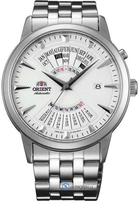 Model FEU0A003WH marki Orient to gustowny zegarek naręczny męski, który posiada pomysłowe rozwiązania i funkcje. Charakterystyczną konstrukcję czasomierza uzyskano z pomocą tarczy w kolorze białym. Aktualna godzina pokazywana jest w sposób analogowy co niezmiernie łatwo pozwala ją odczytać. Koperta w odcieniach koloru srebrnego szeroka jest na 42 mm oraz ma grubość 12 mm - wyróżnia się okrągłym kształtem.