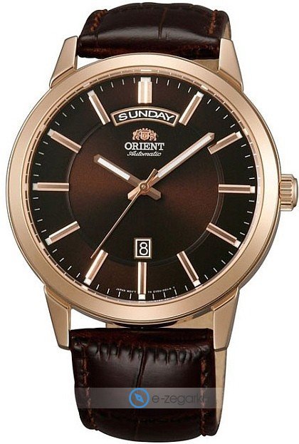 Zegarek męski FEV0U002TH marki Orient to dobra pozycja dla ludzi ceniących sobie dbałość o szczegóły a także bezproblemowe funkcjonowanie mechanizmów. Wysokiej jakości cyferblat zegarka pokryto brązowym kolorem. Godzina przedstawiona jest w sposób analogowy co niezmiernie łatwo pozwala ją odczytać. Koperta szeroka jest na 42 mm oraz ma grubość 11 mm - w kształcie okrągłym.