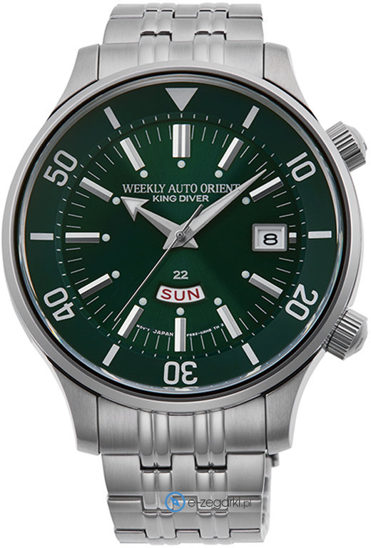 Męski zegarek Orient RA-AA0D03E King Diver to zegarek, który dzięki swemu wzornictwu zawsze będzie prezentował się dobrze. Ciekawą stylistykę czasomierza osiągnięto dzięki tarczy w kolorze zielonym. Zegarek ten prezentuje godzinę w formacie analogowym dzięki temu odczyt jest bezproblemowy. Koperta w odcieniach koloru srebrnego szeroka jest na 44 mm oraz ma grubość 14 mm - wyróżnia się okrągłym kształtem.