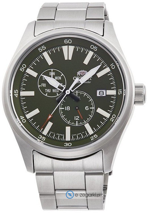 Zegarek męski RA-AK0402E10B marki Orient to ciekawa pozycja dla osób ceniących sobie dbałość o szczegóły a także bezawaryjne funkcjonowanie mechanizmów. Niestereotypowy wygląd czasomierza uzyskano również dzięki tarczy w kolorze zielonym. Zaprezentowana metodą analogową aktualna godzina jest czytelna i szybka do odczytania. Koperta została pokryta kolorem srebrnym szeroka jest na 42 mm oraz ma grubość 13 mm - ma okrągły kształt.