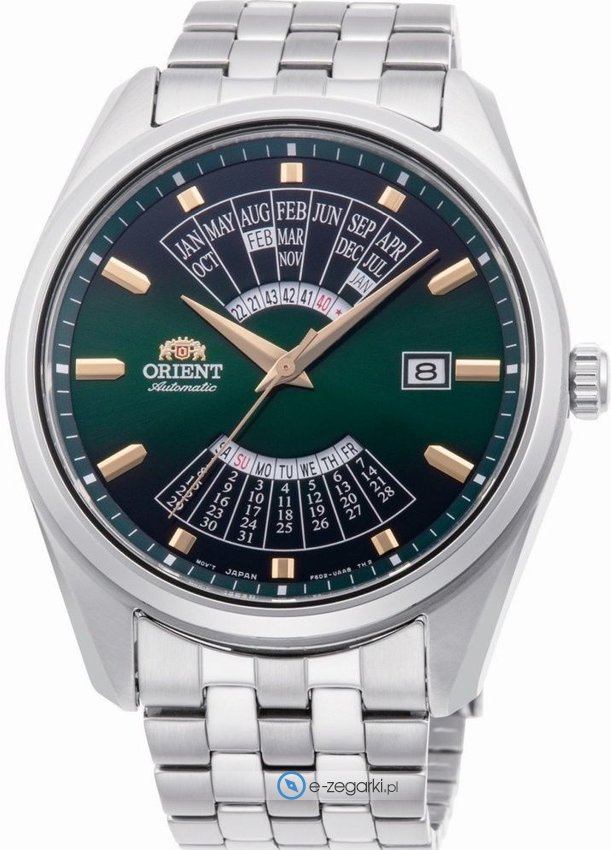 Model RA-BA0002E30B marki Orient to elegancki zegarek naręczny męski, który posiada pomysłowe rozwiązania oraz funkcje. Tarcza zegarka jest w kolorze zielonym. Aktualna godzina zaprezentowana jest w sposób analogowy co intuicyjnie pozwala ją odczytać. Koperta w barwach koloru srebrnego szeroka jest na 42 mm oraz ma grubość 12 mm - cechuje się okrągłym kształtem.