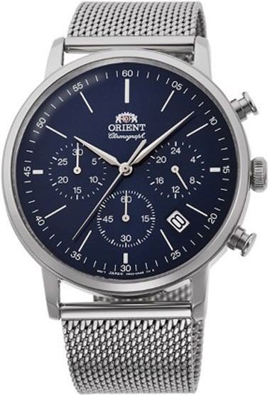 Model RA-KV0401L10B marki Orient to gustowny zegarek naręczny męski, który posiada ciekawe rozwiązania i funkcje. Wysokiej jakości tarczę zegarka pokryto granatowym kolorem. Aktualna godzina pokazywana jest w sposób analogowy co niezmiernie łatwo pozwala ją odczytać. Koperta w odcieniach koloru srebrnego szeroka jest na 42 mm oraz ma grubość 12 mm - posiada okrągły kształt.