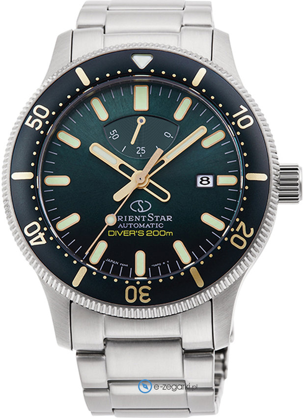 Zegarek męski RE-AU0307E00B marki Orient Star to dobre połączenie funkcjonalności i ciekawego designu. Cyferblat zegarka jest w kolorze zielonym. Zegarek ten pokazuje godzinę w formacie analogowym dzięki temu odczyt jest bezproblemowy. Koperta jest w kolorze srebrnym szeroka jest na 44 mm - w kształcie okrągłym.
