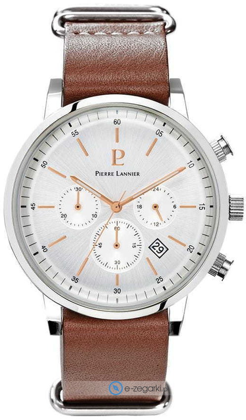 Zegarek męski 207H124 marki Pierre Lannier to ciekawa pozycja dla ludzi ceniących sobie dbałość o detale oraz sprawne działanie mechanizmów. Ciekawą konstrukcję czasomierza uzyskano z pomocą tarczy w kolorze srebrnym. Pokazana metodą analogową aktualna godzina jest czytelna i szybka do odczytania. Koperta w barwach koloru srebrnego szeroka jest na 42 mm oraz ma grubość 11 mm - w kształcie okrągłym.