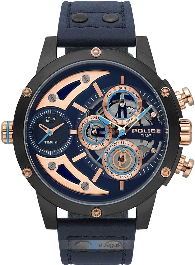 Model PL.15406JSU/03 marki Police to gustowny zegarek naręczny męski, który posiada pomysłowe rozwiązania oraz funkcje. Atrakcyjny wygląd zegarka uzyskano m.in. poprzez cyferblat w kolorze granatowym. Koperta została ozdobiona kolorem czarnym szeroka jest na 50 mm oraz ma grubość 13 mm - posiada okrągły kształt.