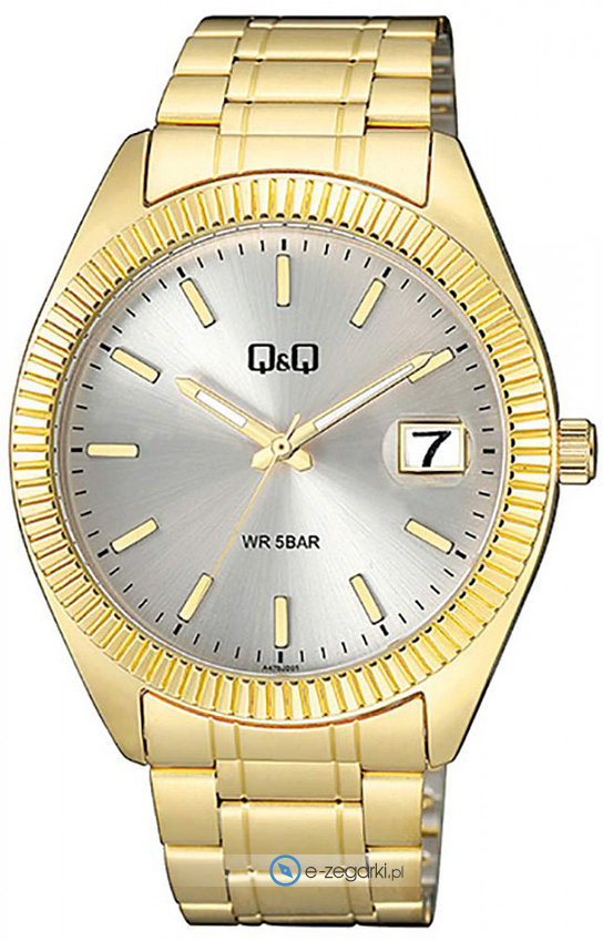 Model A476-001 marki Q&Q to elegancki zegarek naręczny męski, który posiada ciekawe rozwiązania oraz funkcje. Tarcza zegarka jest w kolorze srebrnym. Godzina prezentowana jest w sposób analogowy co niezmiernie łatwo pozwala ją odczytać. Koperta jest w kolorze złotym szeroka jest na 42 mm oraz ma grubość 11 mm - posiada okrągły kształt.