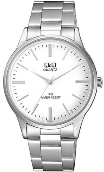 Model C214-201 marki Q&Q to stylowy zegarek naręczny męski, który posiada pomysłowe rozwiązania i funkcje. Charakteru dodaje wysokiej klasy tarcza w kolorze białym. Zegarek ten pokazuje aktualny czas w formacie analogowym dzięki temu odczyt jest bezproblemowy. Koperta w barwach koloru srebrnego szeroka jest na 40 mm oraz ma grubość 9 mm - cechuje się okrągłym kształtem.