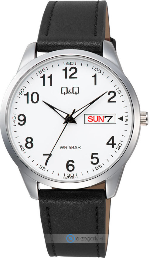 Zegarek C32A-006P zasilany jest za pomocą baterii kwarcowej. Pasek czarnego koloru zrobiony jest z wysokiej jakości skóry zapewniającej trwałość i wygodę noszenia.