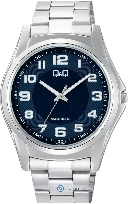 Model C41A-004P marki Q&Q to elegancki zegarek naręczny męski, który posiada pomysłowe rozwiązania oraz funkcje. Charakterystyczną konstrukcję czasomierza uzyskano dzięki tarczy w kolorze niebieskim. Zegarek ten pokazuje godzinę w formacie analogowym dzięki temu odczyt jest intuicyjny. Koperta została pokryta kolorem srebrnym szeroka jest na 43 mm oraz ma grubość 9 mm - posiada okrągły kształt.