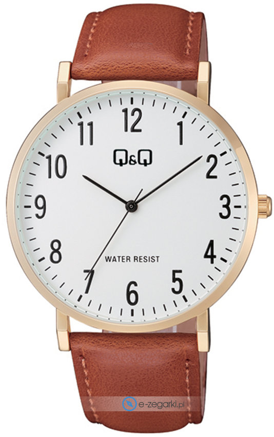 Zegarek męski C43A-003P marki Q&Q to dobra pozycja dla ludzi ceniących sobie dbałość o szczegóły oraz bezproblemowe funkcjonowanie mechanizmów. Ciekawą stylistykę czasomierza osiągnięto z pomocą tarczy w kolorze białym. Pokazana metodą analogową bieżąca godzina jest czytelna i łatwa do odczytania. Koperta jest w kolorze złotym szeroka jest na 44 mm oraz ma grubość 8 mm - posiada okrągły kształt.