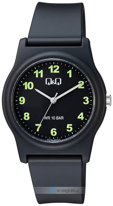 Zasilanie zegarka G22A-002V to standardowa bateria kwarcowa. Pasek czarnego koloru zrobiony jest z wysokiej jakości tworzywa sztucznego.