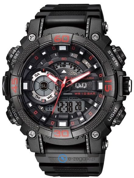 Model GW87-002 marki Q&Q to gustowny zegarek naręczny męski, który posiada pomysłowe rozwiązania i funkcje. Nieschematyczny wygląd czasomierza osiągnięto dzięki tarczy w kolorze czarnym. Koperta jest w kolorze czarnym szeroka jest na 50 mm oraz ma grubość 20 mm.