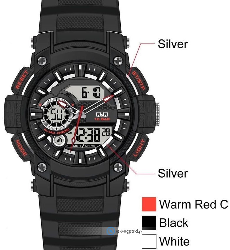 Model GW90-002 marki Q&Q to stylowy zegarek naręczny męski, który posiada pomysłowe rozwiązania i funkcje. Koperta jest w kolorze czarnym o grubości 20 mm.