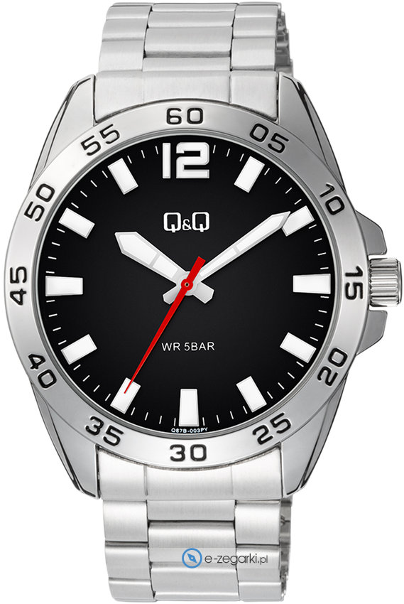 Model Q87B-003P marki Q&Q to stylowy zegarek naręczny męski, który jest wyposażony w pomysłowe rozwiązania i funkcje. Atrakcyjną stylistykę czasomierza uzyskano z pomocą tarczy w kolorze czarnym. Zaprezentowana metodą analogową bieżąca godzina jest czytelna i prosta do odczytania. Koperta jest pokryta kolorem srebrnym szeroka jest na 44 mm oraz ma grubość 12 mm - w kształcie okrągłym.