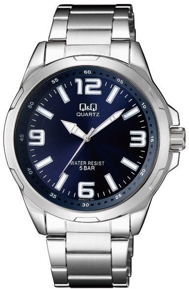 Model QA48-215 marki Q&Q to stylowy zegarek naręczny męski, który posiada ciekawe rozwiązania i funkcje. Niebanalny wygląd czasomierza osiągnięto poprzez tarczę w kolorze niebieskim. Koperta jest pokryta kolorem srebrnym o grubości 97 mm - wyróżnia się okrągłym kształtem.