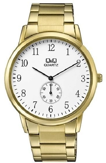 Męski zegarek Q&Q QA60-004 to zegarek, który dzięki swemu wzornictwu zawsze będzie prezentował się dobrze. Charakteru nadaje wysokiej jakości tarcza w kolorze białym. Aktualna godzina prezentowana jest w sposób analogowy co niezmiernie łatwo pozwala ją odczytać. Koperta została ozdobiona kolorem złotym szeroka jest na 42 mm.