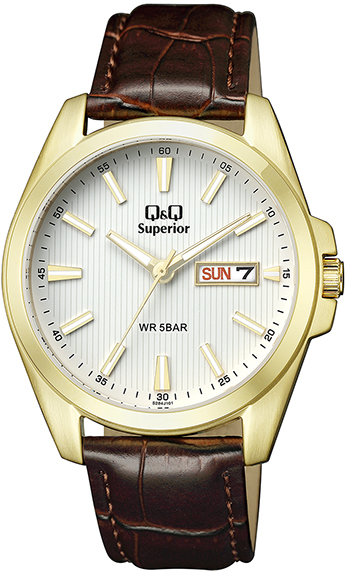 Model S284-101 marki Q&Q to stylowy zegarek naręczny męski, który jest wyposażony w pomysłowe rozwiązania oraz funkcje. Nieschematyczny wygląd czasomierza osiągnięto m.in. poprzez cyferblat w kolorze białym. Zaprezentowana metodą analogową bieżąca godzina jest czytelna i szybka do sprawdzenia. Koperta jest w kolorze złotym szeroka jest na 40 mm oraz ma grubość 9.69 mm - wyróżnia się okrągłym kształtem.