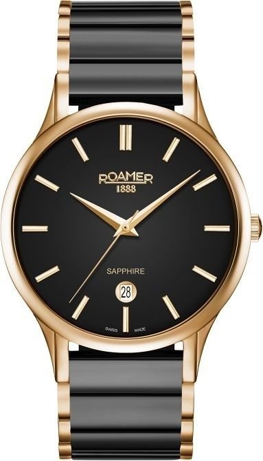 Męski zegarek Roamer 657833 49 55 60 to zegarek, który dzięki swemu wzornictwu zawsze będzie prezentował się dobrze. Atrakcyjną budowę czasomierza osiągnięto dzięki tarczy w kolorze czarnym. Koperta szeroka jest na 40 mm oraz ma grubość 8 mm - wyróżnia się okrągłym kształtem.