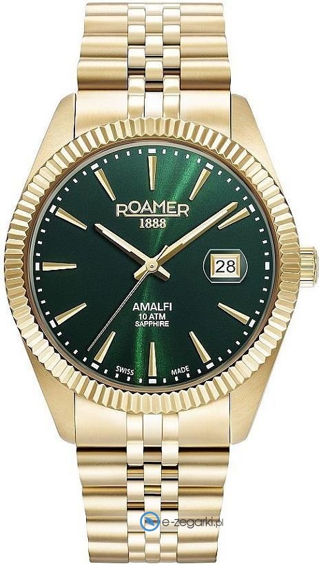 Zegarek męski 852833 48 75 20 marki Roamer to idealna propozycja dla osób ceniących sobie dbałość o detale jak również bezawaryjne funkcjonowanie mechanizmów. Cyferblat zegarka jest w kolorze zielonym. Zaprezentowana metodą analogową bieżąca godzina jest czytelna i szybka do odczytania. Koperta jest w kolorze złotym szeroka jest na 42 mm oraz ma grubość 10 mm - w kształcie okrągłym.