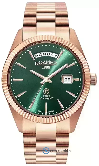 Męski zegarek Roamer 981666 46 75 50 to zegarek, który dzięki swemu wzornictwu zawsze będzie prezentował się dobrze. Charakterystyczną konstrukcję zegarka uzyskano dzięki tarczy w kolorze zielonym. Zaprezentowana metodą analogową bieżąca godzina jest czytelna i łatwa do odczytania. Koperta w barwach koloru złotego szeroka jest na 41 mm oraz ma grubość 11 mm - ma okrągły kształt.