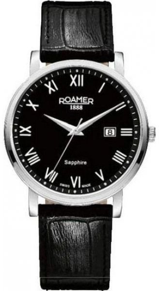 Model męski 709856 41 52 07 marki Roamer należy do rodziny Classic Line Gents. Cyferblat zegarka w kolorze czarnym. Koperta jest w kolorze stalowym szeroka jest na 40 mm oraz ma grubość 7 mm - posiada okrągły kształt.