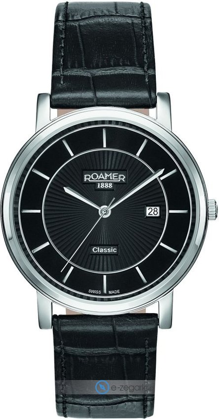 Zegarek męski 709856 41 57 07 zalicza się do serii Roamer Classic Line Gents marki Roamer. Charakter zapewnia wysokiej klasy cyferblat w kolorze czarnym. Koperta w odcieniach koloru stalowego szeroka jest na 40 mm oraz ma grubość 7 mm - w kształcie okrągłym.