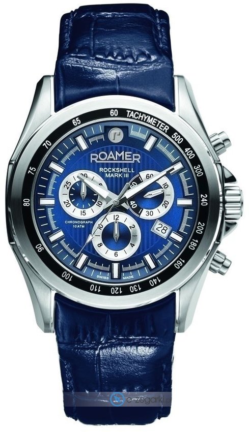 Model męski 220837 41 45 02 marki Roamer z kolekcji Rockshell Mark III Chrono. Ciekawą konstrukcję czasomierza uzyskano dzięki tarczy w kolorze granatowym. Koperta jest w kolorze stalowym szeroka jest na 44 mm oraz ma grubość 12 mm - w kształcie okrągłym.
