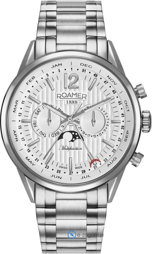 Zegarek męski 508822 41 14 50 marki Roamer to idealne połączenie funkcjonalności a także modnego designu. Model ten w gamie pozostałych zegarków tego producenta występuje w kolekcji Roamer Superior Business Multifunctio. Niebanalną budowę czasomierza osiągnięto dzięki tarczy w kolorze białym. Koperta w odcieniach koloru stalowego szeroka jest na 43 mm - cechuje się okrągłym kształtem.