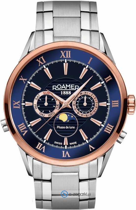 Zegarek męski 508821 47 43 50 marki Roamer to idealne połączenie funkcjonalności i ciekawego wzornictwa. Model ten występuje w serii Roamer Superior Moonphase. Stylu nadaje wysokiej klasy tarcza w kolorze granatowym. Zegarek ten prezentuje godzinę w formacie analogowym dzięki czemu odczyt jest bardzo łatwy. Koperta szeroka jest na 43 mm - charakteryzuje się okrągłym kształtem.