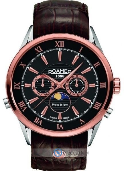 Zegarek męski 508821 49 53 05 marki Roamer to dobre połączenie funkcjonalności i modnego designu. Model ten pochodzi z kolekcji Superior Moonphase. Styl zapewnia wysokiej jakości cyferblat w kolorze czarnym. Koperta szeroka jest na 43 mm oraz ma grubość 12 mm - posiada okrągły kształt.