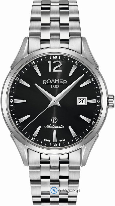 Zegarek męski 550660 41 55 50 marki Roamer to dobre połączenie funkcjonalności i modnego designu. Model ten pochodzi z serii Swiss Matic. Wysokiej jakości cyferblat zegarka ozdobiono czarnym kolorem. Koperta jest pokryta kolorem stalowym szeroka jest na 41 mm - ma okrągły kształt.