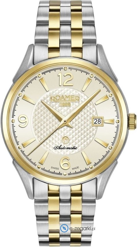 Zegarek 550660 47 34 50 marki Roamer to stylowy zegarek naręczny męski, który posiada pomysłowe rozwiązania oraz funkcje. Model ten jest z kolekcji Swiss Matic. Charakterystyczny wygląd czasomierza uzyskano dzięki tarczy w kolorze złotym. Koperta szeroka jest na 41 mm - posiada okrągły kształt.