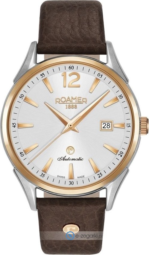 Model męski 550660 49 25 05 należy do kolekcji Roamer Swiss Matic marki Roamer. Charakter zapewnia wysokiej klasy cyferblat w kolorze białym. Godzina zaprezentowana jest w sposób analogowy co niezmiernie łatwo pozwala ją odczytać. Koperta jest w kolorze różowo złotym szeroka jest na 41 mm - w kształcie okrągłym.