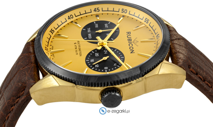 Zegarek męski RNCD69TIYX05AX marki Rubicon to dobre połączenie funkcjonalności oraz ciekawego designu. Charakteru dodaje wysokiej klasy tarcza w kolorze złotym. Zaprezentowana metodą analogową aktualna godzina jest czytelna i prosta do sprawdzenia. Koperta została ozdobiona kolorem czarnym szeroka jest na 43 mm - w kształcie okrągłym.