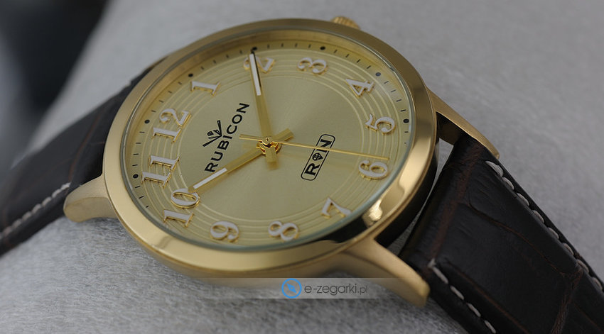 Zegarek męski RNDC64ZAGX marki Rubicon to idealna propozycja dla osób ceniących sobie dbałość o detale a także sprawne zachowanie mechanizmów. Ciekawy wygląd czasomierza uzyskano także dzięki tarczy w kolorze złotym. Zegarek ten pokazuje godzinę w formacie analogowym dzięki temu odczyt jest intuicyjny. Koperta jest w kolorze złotym szeroka jest na 39 mm - charakteryzuje się okrągłym kształtem.