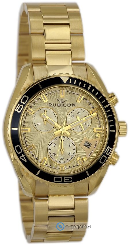Model RNDD19GIGX10AX marki Rubicon to stylowy zegarek naręczny męski, który wyposażono w pomysłowe rozwiązania oraz funkcje. Charakterystyczną stylistykę zegarka osiągnięto dzięki tarczy w kolorze szampańskim. Zegarek ten pokazuje godzinę w formacie analogowym dzięki temu odczyt jest bardzo łatwy. Koperta jest w kolorze złotym szeroka jest na 43 mm oraz ma grubość 12 mm - w kształcie okrągłym.