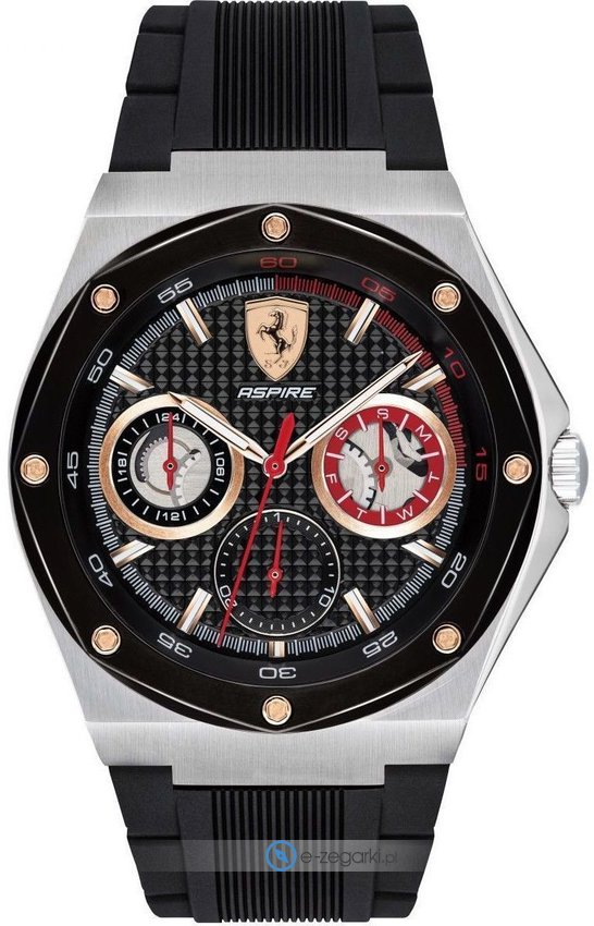 Zegarek męski 0830556 Aspire marki Scuderia Ferrari to idealne połączenie funkcjonalności oraz modnego wzornictwa. Zegarek ten prezentuje godzinę w formacie analogowym dzięki czemu odczyt jest intuicyjny. Koperta szeroka jest na 44 mm oraz ma grubość 10 mm - w kształcie okrągłym.