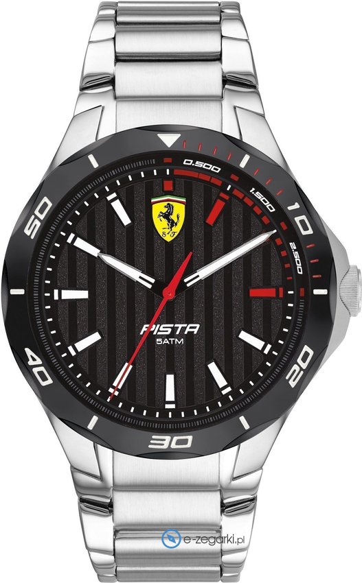 Zegarek męski 830750 Pista marki Scuderia Ferrari to dobre połączenie funkcjonalności oraz ciekawego designu. Charakter zapewnia wysokiej jakości cyferblat w kolorze czarnym. Zegarek ten pokazuje godzinę w formacie analogowym dzięki temu odczyt jest bezproblemowy. Koperta w barwach koloru srebrnego szeroka jest na 44 mm - cechuje się okrągłym kształtem.