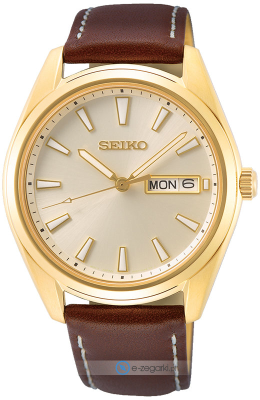 Zegarek męski SUR450P1 marki Seiko to dobra pozycja dla osób ceniących sobie dbałość o detale a także bezawaryjne zachowanie mechanizmów. Nieschematyczny wygląd zegarka osiągnięto także dzięki tarczy w kolorze złotym. Aktualna godzina przedstawiona jest w sposób analogowy co intuicyjnie pozwala ją odczytać. Koperta w barwach koloru złotego szeroka jest na 40 mm oraz ma grubość 8 mm - w kształcie okrągłym.