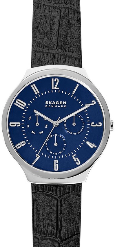Zegarek męski SKW6535 z rodziny Skagen Grenen marki Skagen. Atrakcyjny wygląd czasomierza osiągnięto m.in. poprzez cyferblat w kolorze granatowym. Zegarek ten pokazuje godzinę w formacie analogowym dzięki temu odczyt jest intuicyjny. Koperta jest w kolorze srebrnym szeroka jest na 42 mm oraz ma grubość 8 mm - cechuje się okrągłym kształtem.