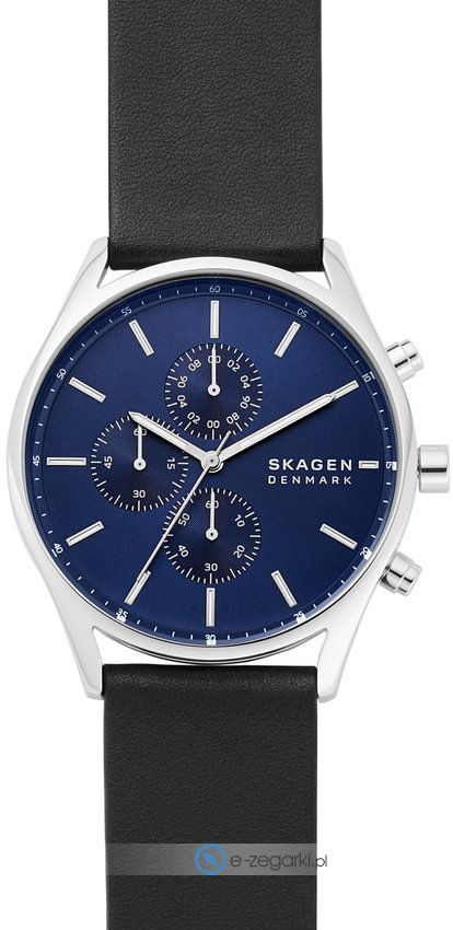 Zegarek męski SKW6606 marki Skagen należy do kolekcji Skagen Holst. Atrakcyjny wygląd czasomierza uzyskano także dzięki tarczy w kolorze granatowym. Pokazana metodą analogową aktualna godzina jest czytelna i prosta do odczytania. Koperta w barwach koloru srebrnego szeroka jest na 42 mm - posiada okrągły kształt.