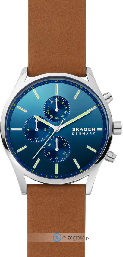 Zegarek męski SKW6732 marki Skagen to stylowe połączenie funkcjonalności a także ciekawego wzornictwa. Model ten w gamie pozostałych zegarków tego producenta występuje w kolekcji Skagen Holst. Atrakcyjny wygląd zegarka osiągnięto m.in. poprzez cyferblat w kolorze granatowym. Godzina zaprezentowana jest w sposób analogowy co bez trudu pozwala ją odczytać. Koperta w barwach koloru srebrnego szeroka jest na 42 mm - cechuje się okrągłym kształtem.