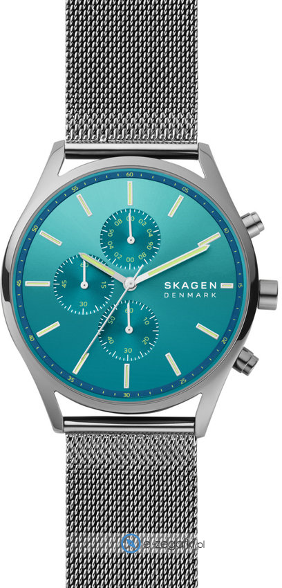 Męski zegarek SKW6734 z kolekcji Skagen Holst marki Skagen to połączenie stylu i ciekawych funkcji. Niestereotypowy wygląd czasomierza uzyskano również dzięki tarczy w kolorze zielonym. Zegarek ten pokazuje aktualny czas w formacie analogowym dzięki temu odczyt jest intuicyjny. Koperta jest ozdobiona kolorem srebrnym szeroka jest na 44 mm - posiada okrągły kształt.