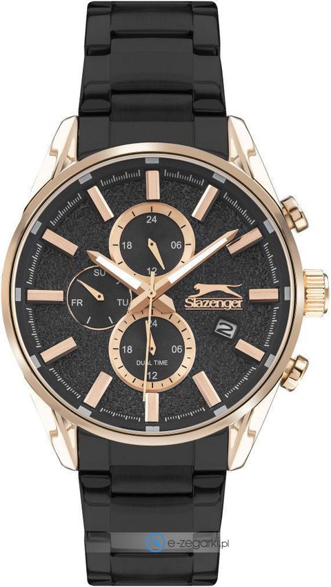 Zegarek męski SL.09.2059.2.03 marki Slazenger to dobra pozycja dla ludzi ceniących sobie dbałość o detale a także sprawne działanie mechanizmów. Wysokiej jakości tarczę zegarka ozdobiono czarnym kolorem. Zegarek ten prezentuje godzinę w formacie analogowym dzięki czemu odczyt jest intuicyjny. Koperta jest w kolorze różowo złotym szeroka jest na 45 mm - ma okrągły kształt.
