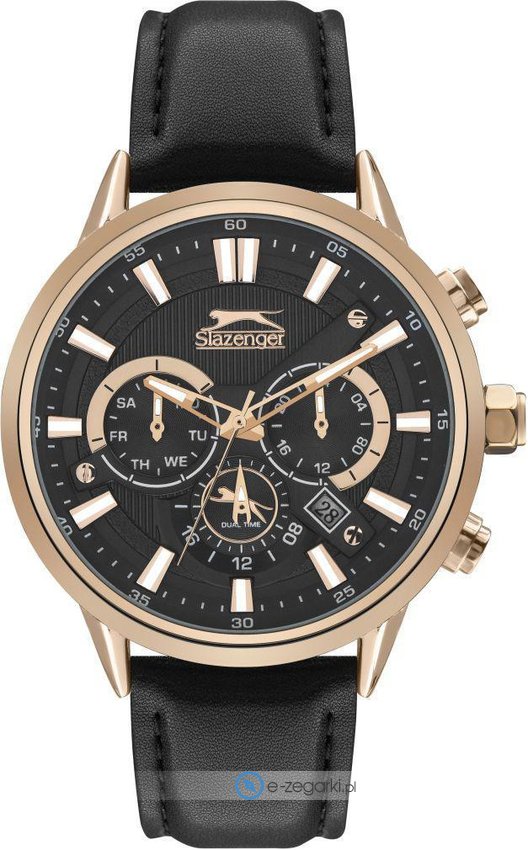 Zegarek męski SL.09.2062.2.05 marki Slazenger to dobre połączenie funkcjonalności i modnego wzornictwa. Tarcza zegarka jest w kolorze czarnym. Zegarek ten pokazuje aktualny czas w formacie analogowym dzięki temu odczyt jest bezproblemowy. Koperta została pokryta kolorem różowo złotym szeroka jest na 45 mm - cechuje się okrągłym kształtem.